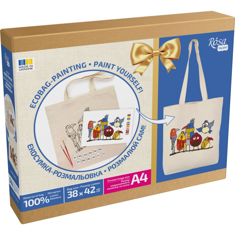 Set, ecobag-coloring Funny birds, 38x42cm, Rosa. Sеt includes: An eco-bag with an applied outline of the picture, Acrylic paints for painting fabrics ROSA TALENT, Artistic brush, A4 file. Mix the paint thoroughly before applying. Colour the picture, guided by the image on the colour chart. Every time you finish painting with one colour, wash the brush well and dry the hair thoroughly with paper towels. Only then proceed to the next colour. Leave the product to dry completely for 48 hours. Fix the pattern with iron without steam, at t 30-40 C, through paper or cotton fabric. The ironing time of one area is 5 minutes.
