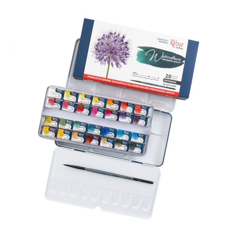 Akvarelinių profesionalių dažų ''BOTANYCAL'' rinkinys ROSA Gallery 28 sp, metalinė dėžutė, teptukas.